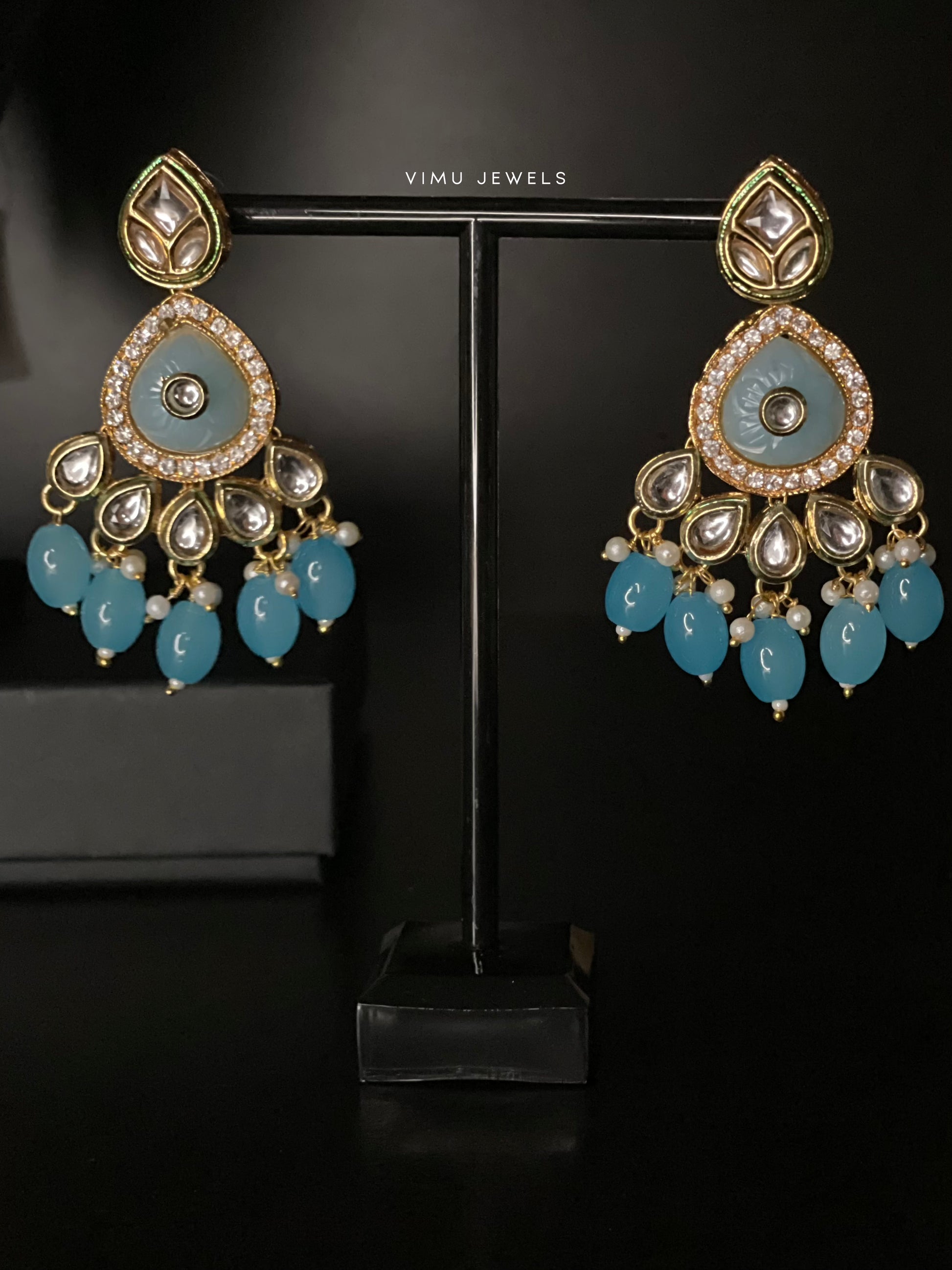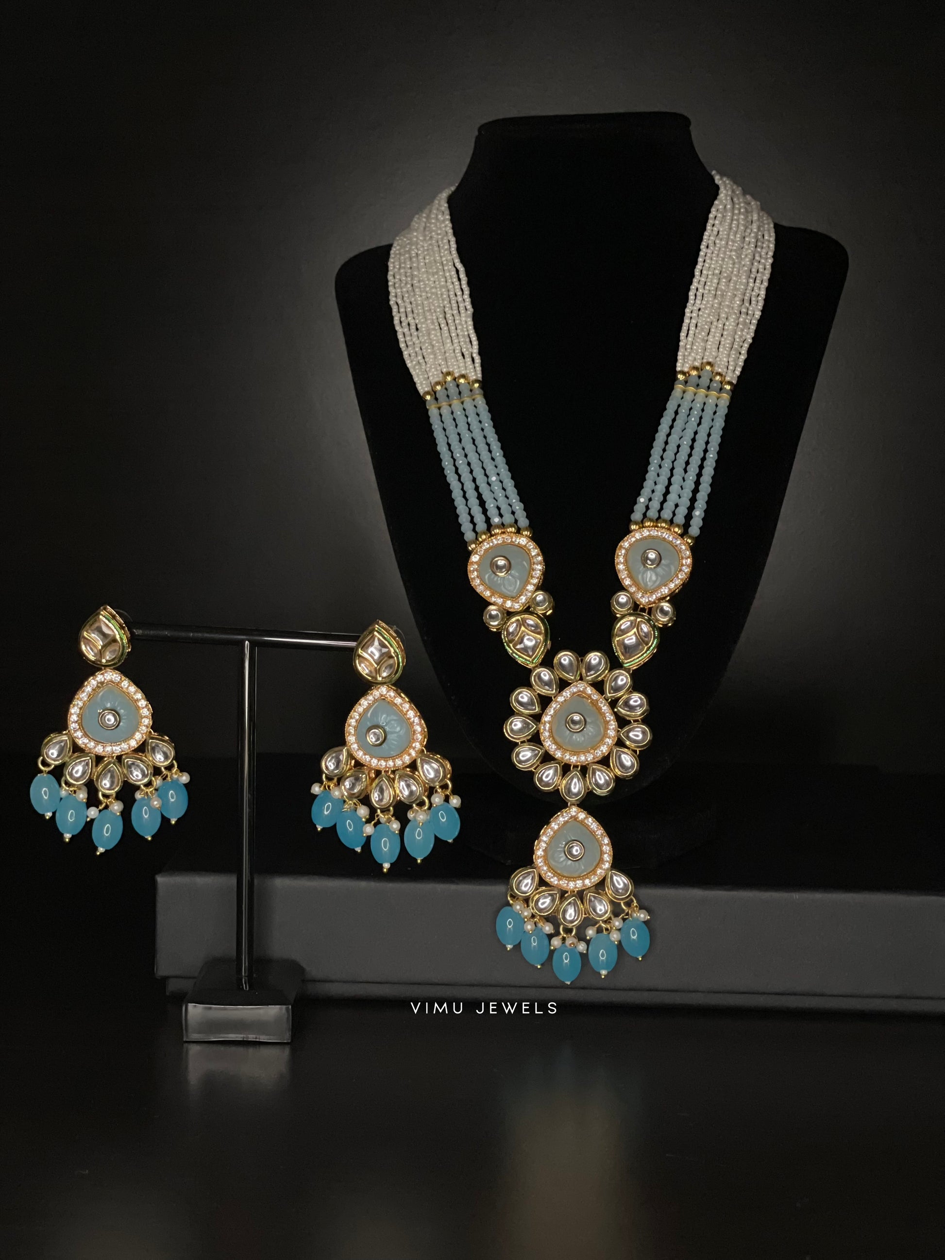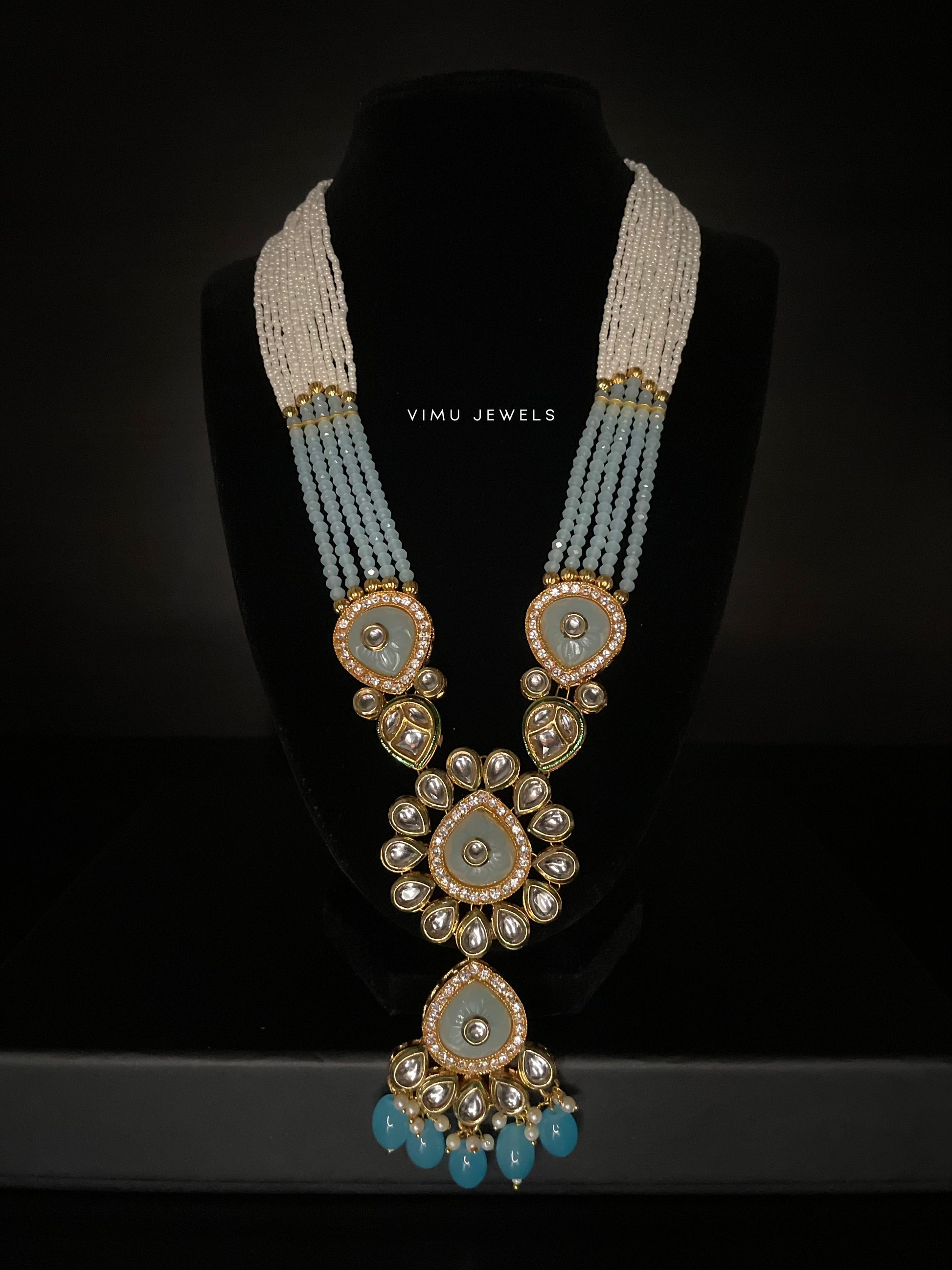a beautiful white or blue kundan mala set with pearl beading, faux diamonds and off-white enamelling. the set is finshed in gold with white beading and mirror work. beautiful for formal events, weddings and parties.