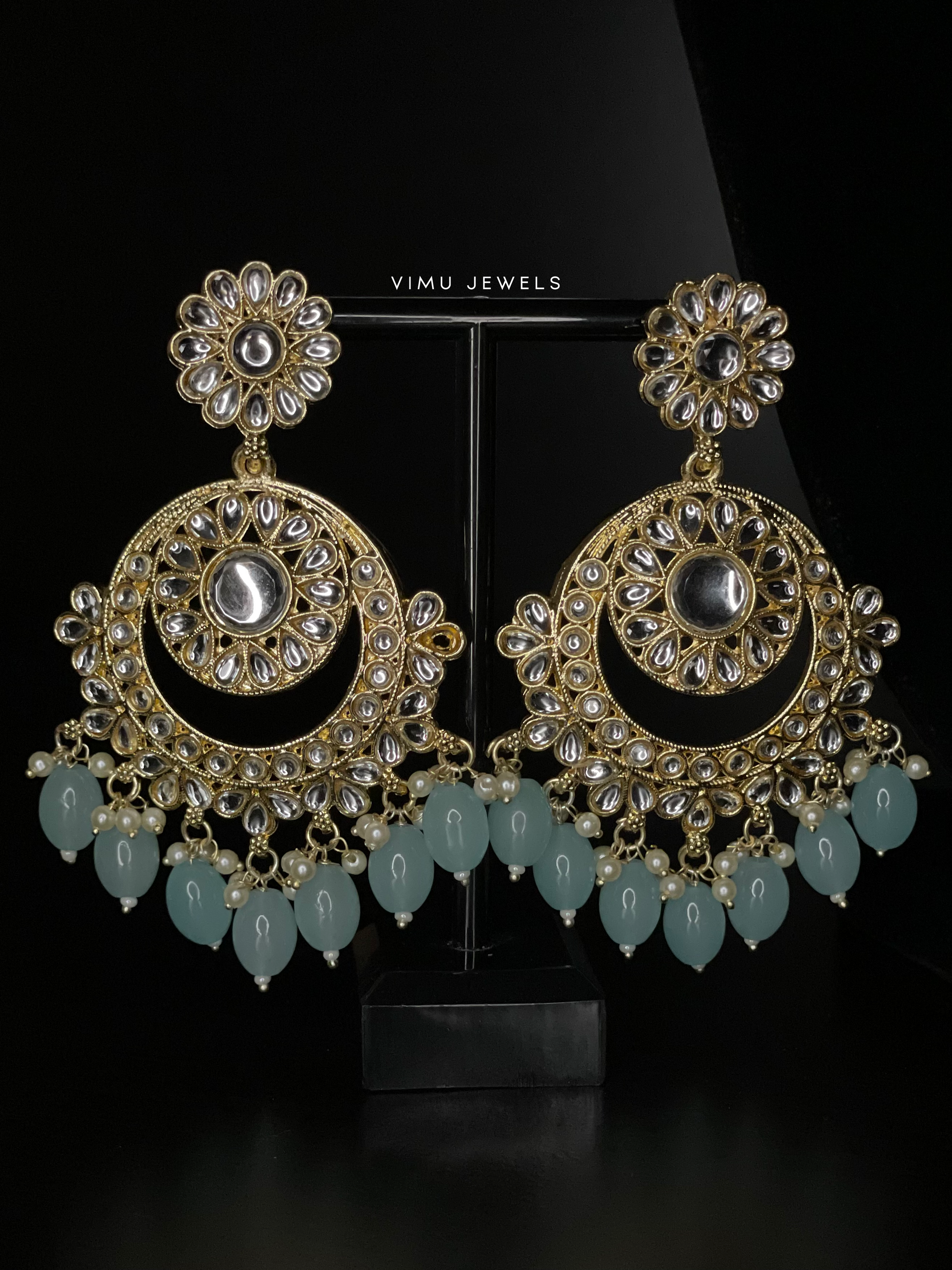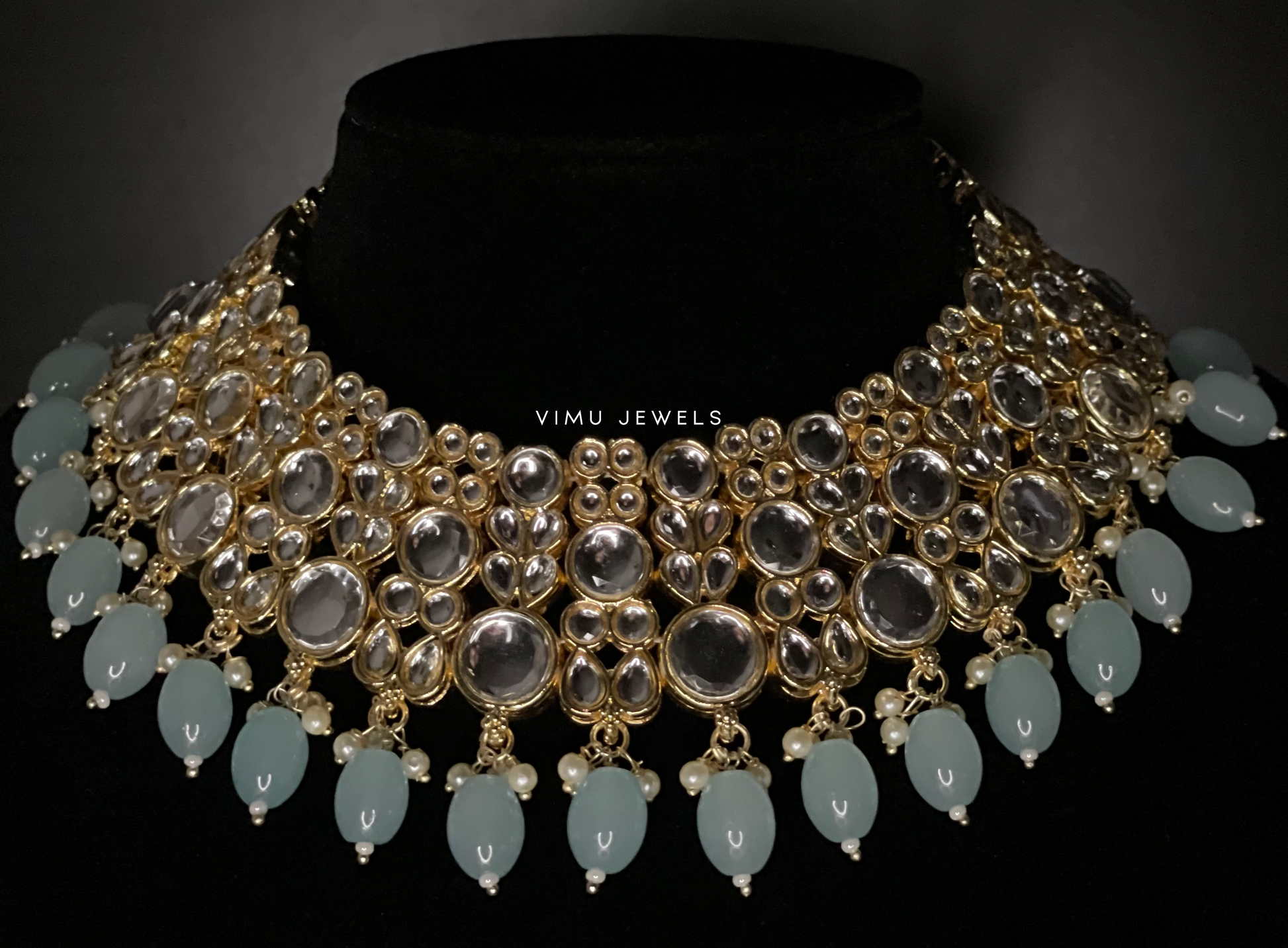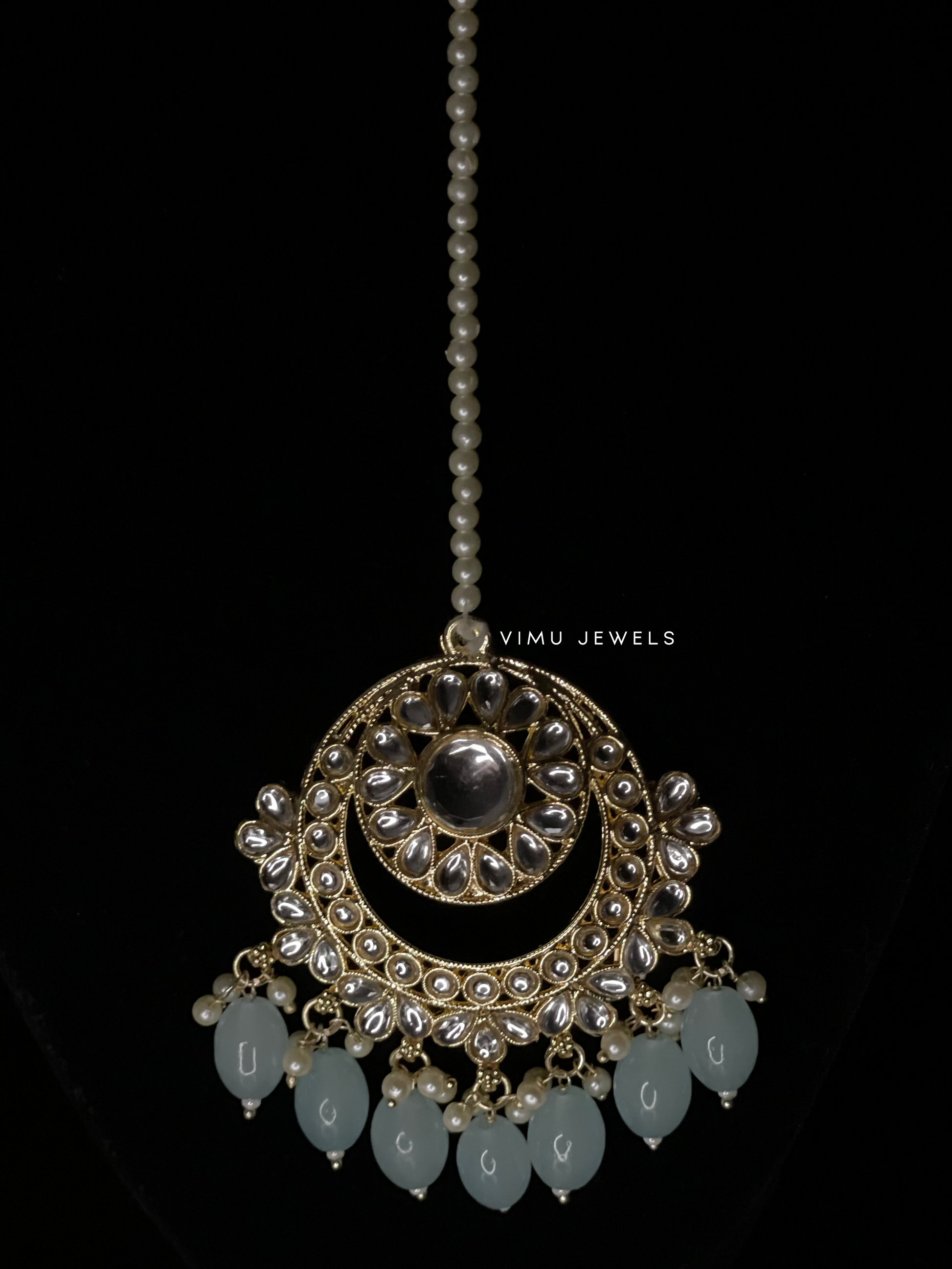 beautiful turquoise blue beads and circular and pear mirrored stones finished in gold with small pearl bead detailing