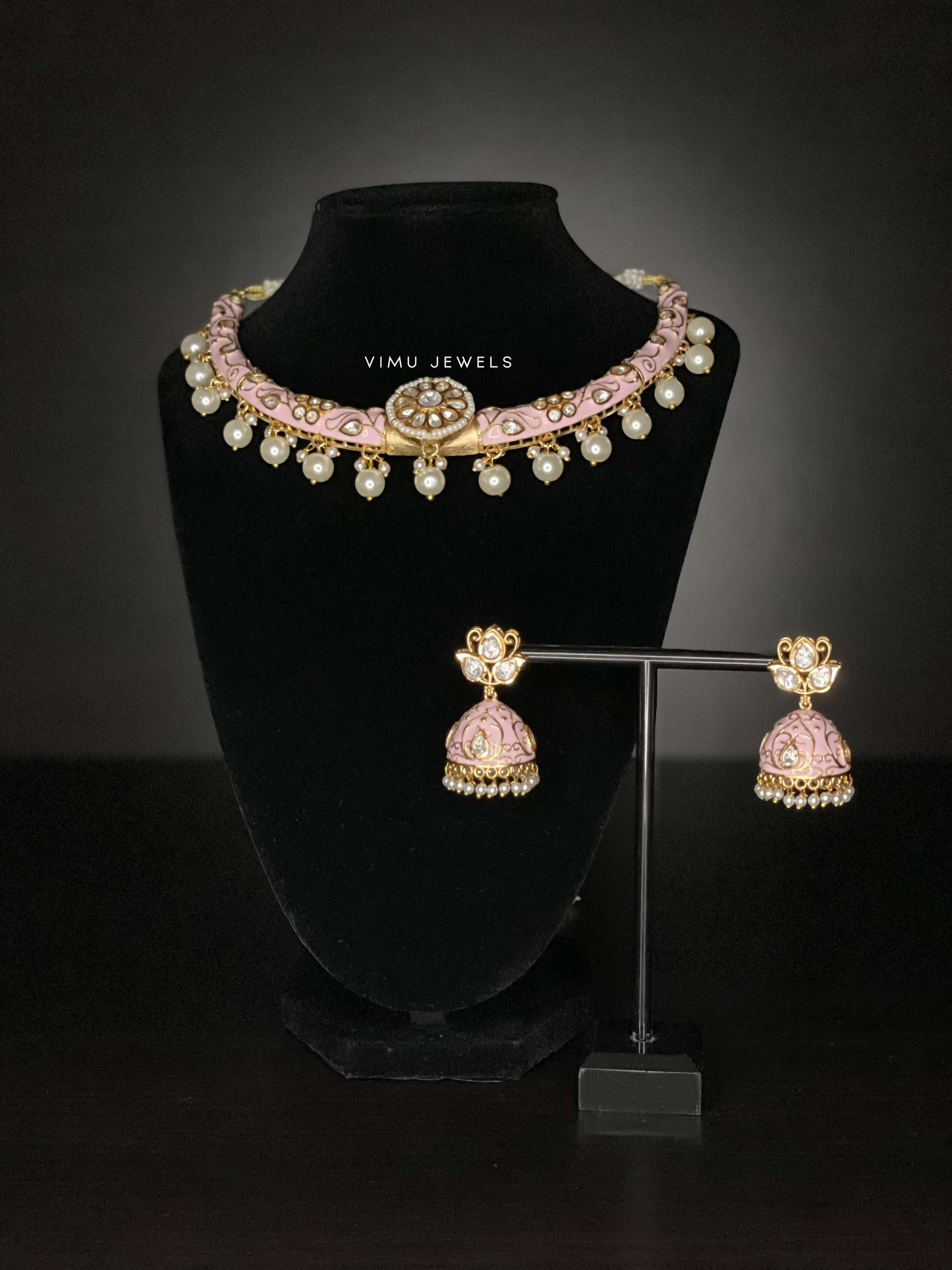 a beautiful meenakari set with pink enamelling on a sturdy neckpiece with two hinges and jhumka earrings, white stones, pearls and gold finishes. a truly unique piece and one of my favourites, perfect for wedding events, parties, Diwali and many more.